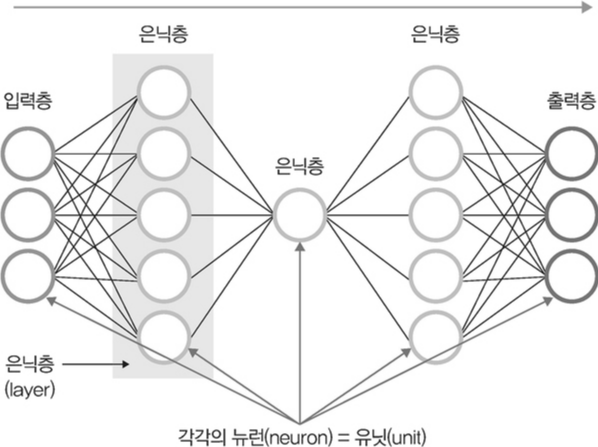 - 은닉층: 모든 뉴런으로 부터 값을 받아 가중합을 계산하고, 이 값을 활성화 함수에 적용하여 출력층에 전달