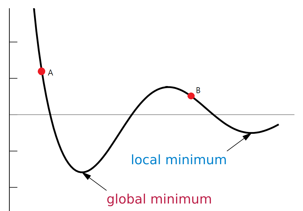 위의 사진과 같이 손실함수에는 Global Minimum (전역 최솟값) 및 Local Minimum (지역 최솟값)이 존재합니다. Local Minimum 은 연못에 빠지는 것과 같이, 일부 구간의 최소 값을 뜻합니다. 더불어, Global Minimum 은 산의 가장 낮은 구간, 즉 전체 구간에서의 최소 값을 뜻합니다. 여기에서 짚고 넘어가야하는 것은 시간을 효율적으로 사용하면서 Local Minimum 값을 Global Minimum 값으로 혼동하는 문제를 피하는 것 입니다.