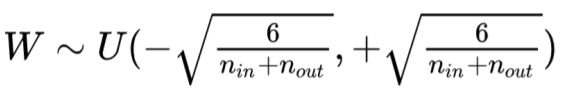 Xavier 초기화 방법은 파라미터가 존재하는 Layer들의 입력/출력 노드 개수에 따라 동적으로 파라미터 값을 정규분포 또는 균등분포에 의해 초기화 시키는 것 입니다. 이전 층의 뉴런의 개수 (in) 및 다음 층의 뉴런의 개수(out)를 이용하여 아래와 같이 식을 세울수 있습니다. 다음은 균등분포를 통해 초기화한 것 입니다.