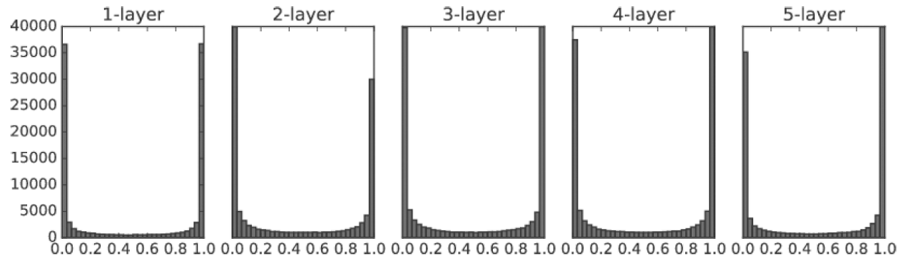 앞의 예시처럼 0과 1에 치우쳐 분포되어 있지 않아 기울기 소실 대해 신경쓰지 않아도 됩니다. 하지만 이번에는 0.5 부근에 집중되어 있어, 표현력 관점에서 문제가 됩니다. 즉 다수의 뉴런이 비슷한 값을 출력하고 있어 개수가 많더라도 의미가 없다는 것을 뜻합니다.