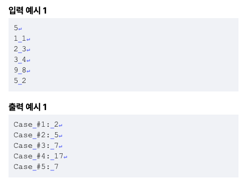 각 테스트 케이스마다 "Case #(테스트 케이스 번호): "를 출력한 다음, A+B를 출력한다.