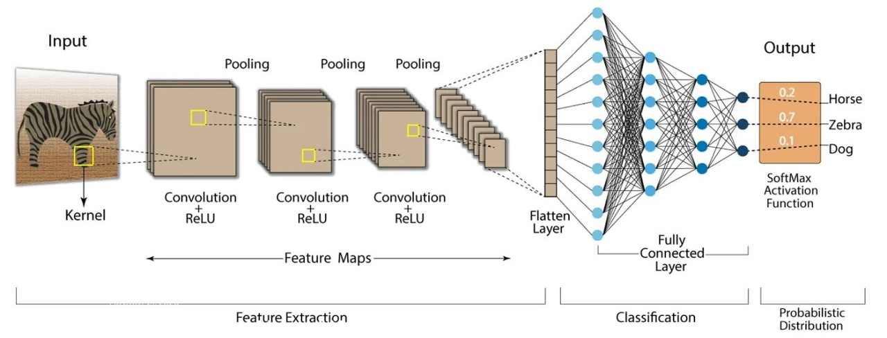 합성곱 신경망은 합성곱층(Convolutional Layer)과 풀링층(Pooling Layer)을 거치면서 입력 이미지의 주요 특성 벡터(Feature Vector)를 추출하게 됩니다. 그 후 추출된 주요 특성 벡터들은 완전연결층(Fully Connected Layer)을 거치면서 1차원 벡터로변환되며, 마지막으로 출력층에서 소프트맥스 활성화 함수를 사용하여 최종 결과가 출력 됩니다. 그럼 이제 입력층부터 출력층까지에 대해 알아보도록 하겠습니다.