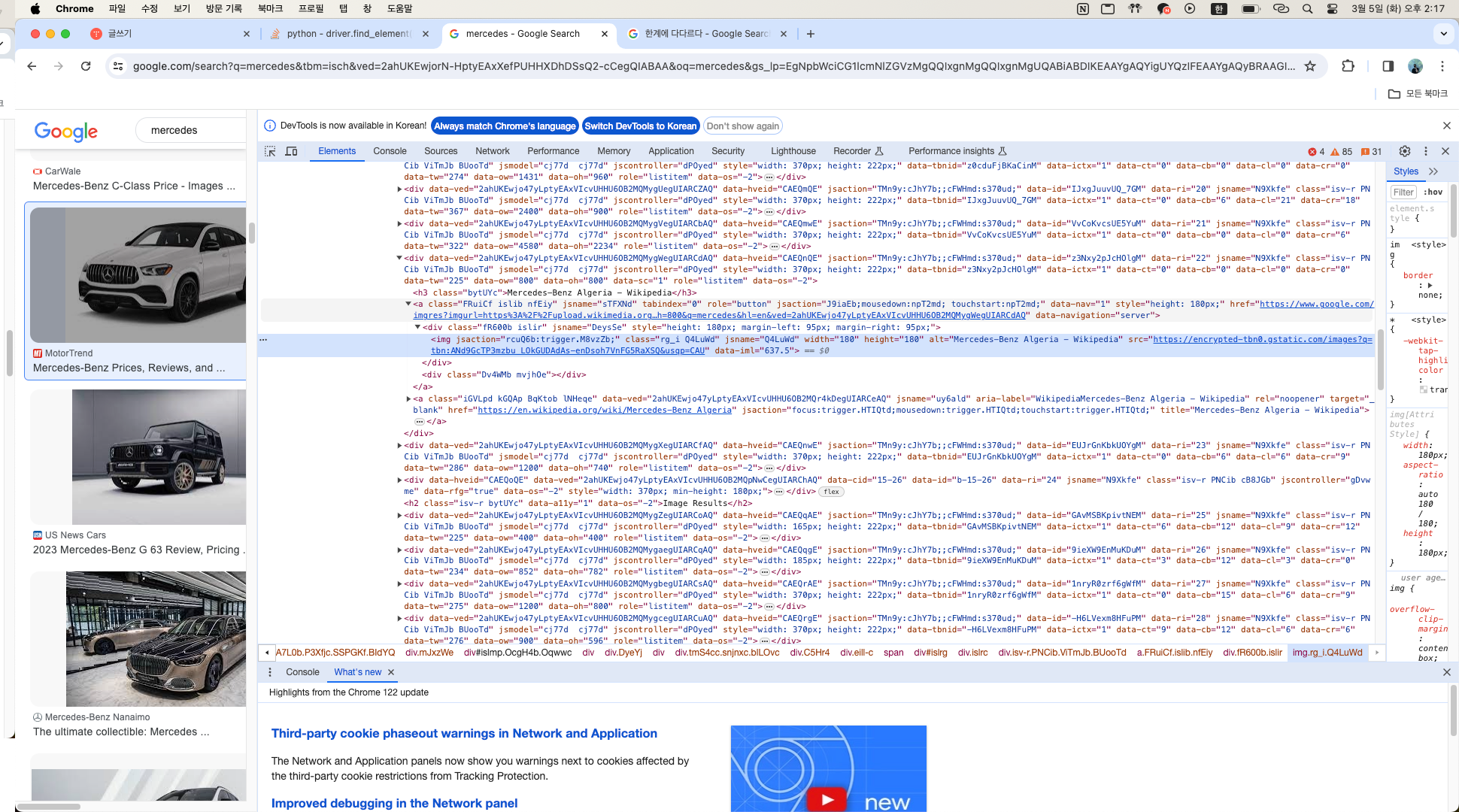 구글 이미지 검색 결과의 각 썸네일 이미지 class name은 ".rg_i.Q4LuWd" 임을 확인할 수 있습니다. 이에 find_elements() 메소드를 사용하여 해당 class name를 가진 모든 요소를 image로 불러오게 됩니다.