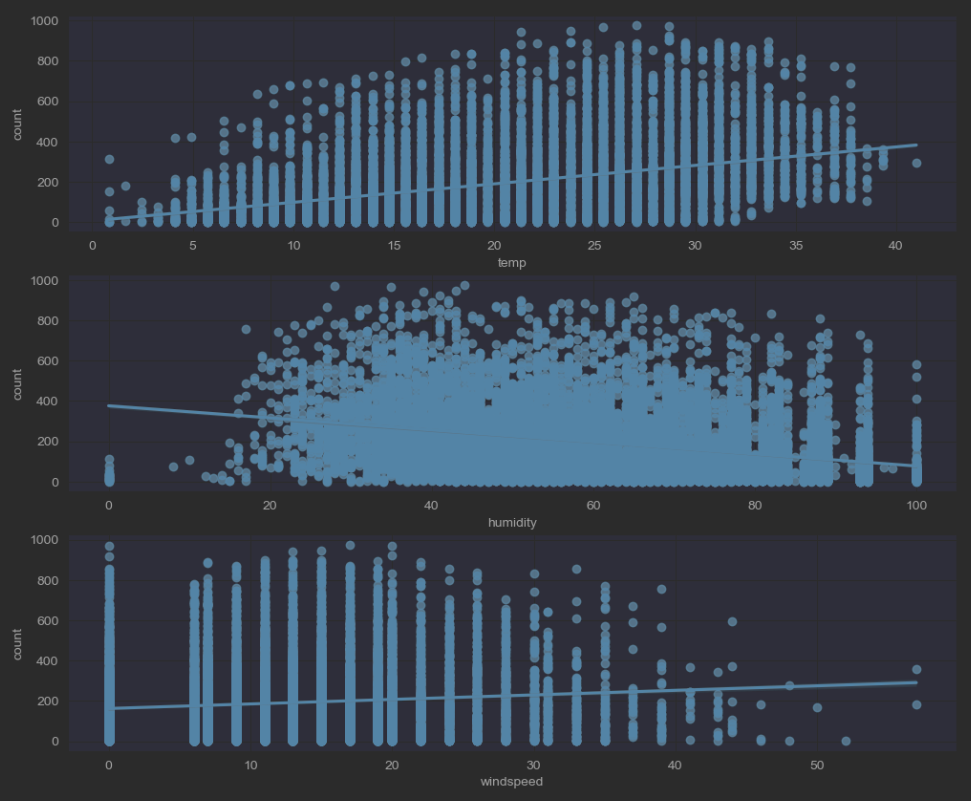 - Windspeed의 regplot 통해 "0" 이라는 값이 무수히 많은걸 파악했습니다. 개인적인 생각으로는 데이터가 수집되어 있지 않아 임의 값 "0"으로 Replaced 된거 같습니다. 이에 RandomForestRegressor 대처하고자 합니다.