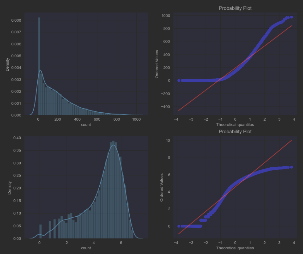 stats.probplot(train['count'], dist = 'norm', fit = True, plot = axes[0][1])
