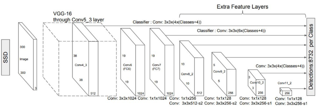 SSD모델 앞부분에서는 VGG16(즉, Base Model)를 사용하여, 입력 이미지로 부터 중요한 특징을 추출하게 됩니다. 이에 추출된 Base Model의 Feature Map은 Extra Feature Layer의 마지막 층까지 통과시켜 최종적으로 Feature Map를 뽑게 됩니다. 그리고 각각의 크기가 다른 Convolutional Layer에서 추출된 Feature Map으로 Detector&Classifier 과정을 수행하고, 마지막으로 NMS을 적용하여 최종적으로 객체인식 결과를 도출하게 됩니다.