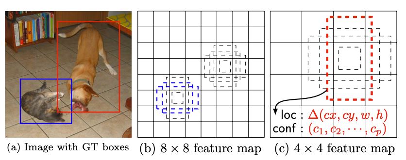 SSD 모델의 아키텍처를 살펴보시면, Convolutional Layer 계층의 크기가 점차적으로 줄어듭니다. 이는 다양한 스케일로 크기가 다른 객체를 탐지하기 위함 입니다. 예를 들어보도록 하겠습니다. 위의 사진을 보면 고양이(파란색 테두리)는 상대적으로 강아지(빨간색 테두리) 보다 더 작습니다. 이에 32 x 32 Feature Map에 해당하는 박스를 사용하여 작은 고양이(파란색 테두리)를 찾고, 16 x 16 Feature Map에서는 강아지(빨간색 테두리)를 탐지하게 됩니다. 정리하자면, 컨볼루션 과정이 깊어지면 깊어질수록 큰 영역의 이미지를 탐지하고, 초반에는 조그만한 영역의 객체를 탐색할 수 있게 됩니다.