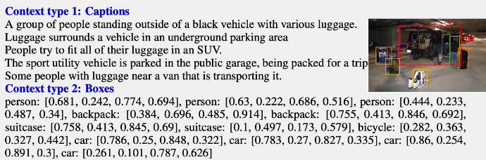 이때 사용되는 Symbolic Representation은 다음과 같은 역할을 수행합니다. (i) Caption은 일반적으로 다양한 관점에서 이미지의 시각적인 장면을 설명합니다. 또한, (ii) Bounding Box는 각 객체를 localize하며, 공간상의 위치 정보를 인코딩합니다. 이러한 접근을 통해 이미지를 LLM이 인식 가능한 시퀸스로 인코딩할 수 있게 되는 것입니다.