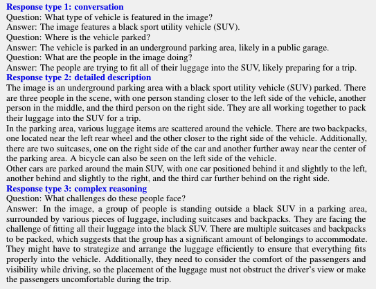 위의 Symbolic representation Contents를 아래의 사진과 같은 prompt에 입력을 합니다. 이러한 과정을 통해 본 논문의 저자들은 COCO 데이터 셋을 활용하였으며, 3가지 타입의 Instruction-following data를 생성하였습니다. 각 타입에 대해서 소수의 예시를 설계하였고, 이를 GPT-4의 in-context-learning에 활용하였습니다. 3가지 타입은 아래와 같습니다.