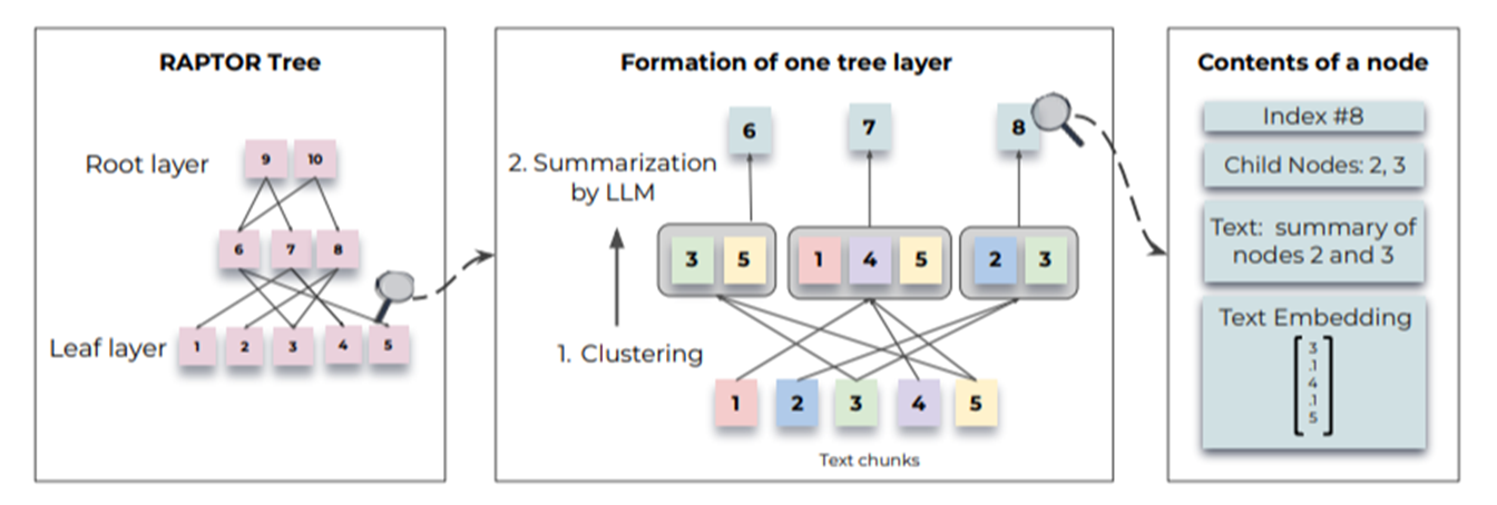1번~5번 노드들은 문서의 문장들을 100 토큰 단위로 쪼갠 것을 뜻한다. 이러한 노드들은 Leaf Layer이라고 칭하며, Clustering 기법을 통해 비슷한 문장끼리 묶어 요약을 진행하게 된다. 이렇게 요약된 내용들이 6번~8번 노드처럼 생성이 되는 것이다.