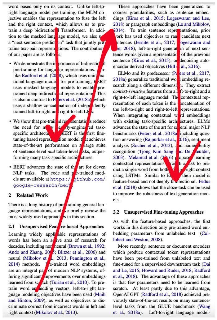 위 그림과 같이 Double-Column 형식을 읽을 때, 빨간색 화살표 방향대로 논문을 읽는다. 파싱하는 관점에서 이는 굉장히 중요하다. Document Parse는 텍스트를 문서의 좌측 상단에서 우측 하단까지 단순하게 위에서 아래로 읽는 방식으로 처리하지만, 좌우 열을 고려하지 않고 직렬화한다는 단점이 존재한다.