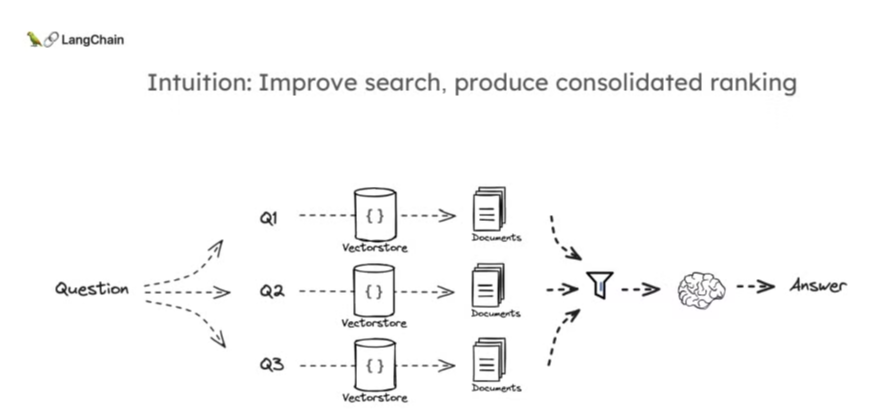RAG Fusion은 위에서 설명한 Multi-Query 방식과 매우 흡사하다. 그러나 RAG Fusion은 Multi-Query 결과를 통합하는 추가적인 과정이 필요하며, 이는 Reciprocal Rank Fusion(RRF)을 통해 이루어진다. RRF는 서로 다른 서브 쿼리에서 검색된 문서들의 순위를 재정렬하여, 가장 관련성이 높고 포괄적인 결과를 제공하는 기법이다.