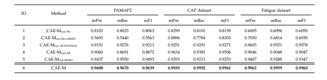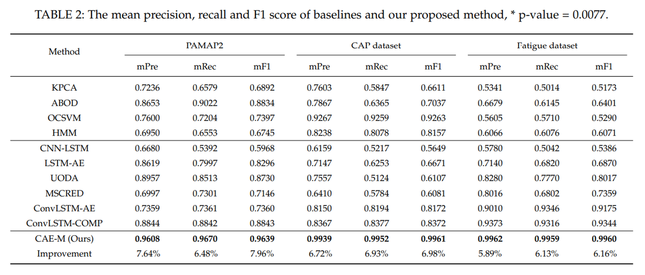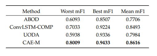 CAE-M 모델 및 Baseline의 평가 지표로 Mean Precision, Mean Recall, Mean F1-Score 사용