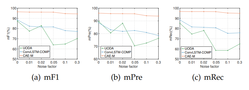 - Noise가 증가할수록 성능은 감소하지만, CAE-M 모델 경우 Noise Data에 대한 Robustness 보임.