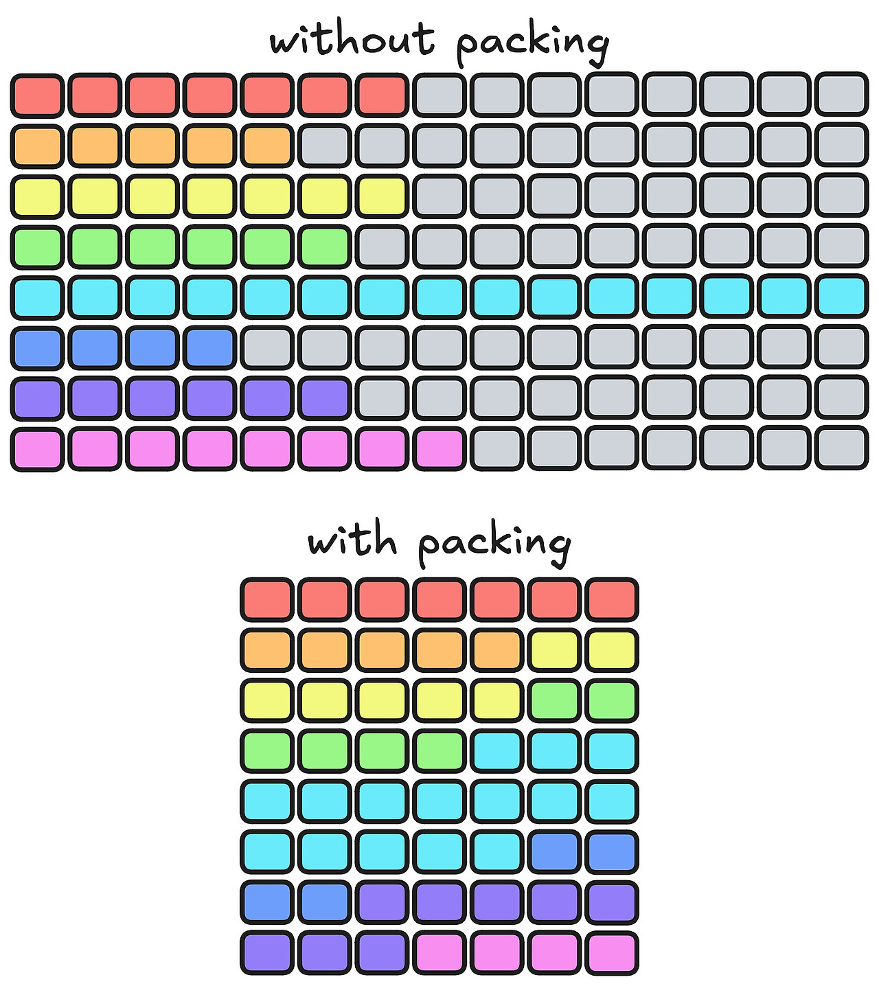 Padding Token은 입력 시퀸스의 길이를 맞추기 위해 추가되는 특수 토큰이다. 트랜스포머 모델은 병렬적으로 모든 토큰을 처리하기 때문에, 입력 시퀸스의 길이가 동일해야한다. 이에 가장 많이 사용되지만, 메모리와 계산량 측면에서 상당한 낭비를 초래한다. 이에 최근에는 Packing으로 시퀸스의 활용도를 극대화하고, 계산 비용을 최소화할 수 있는 Packing이 제안되였다. 하지만, 종종 Packing을 기반으로 파인튜닝하는 게시물 혹은 영상물을 여럿 찾아볼 수 있지만, 이에 대한 성능의 효율성을 보여주는 것이 대부분이다. 구체적으로 패킹이 파인튜닝하는 과정에서 내부적으로 어떻게 작동하는지에 대해서는 설명하지 않는다. 따라서, 본 게시물에서는 Padding과 Packing를 SFT 기반으로 파인튜닝하는 것에 대해 다루고, 차이점을 구체적으로 살펴보고자 한다.