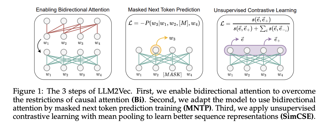 이처럼 MNTP는 마스킹된 바로 이전 토큰의 표현에서 로짓을 계산하여 손실을 구하게 된다. 이러한 방식은 모델이 양방향 문맥 고려할 뿐만 아니라, 기존 Decoder-Only LLM이 훈련하였던 다음 토큰 예측 메커니즘을 유지하는 기법이다. 이러한 이점을 가진 MNTP을 통해 새로운 목표를 기준으로 손실을 계산하고, 역전파를 통해 손실을 줄이는 방향으로 그래디언트를 계산한다. 이에 최종적으로 기존 Causal LM에 최적화되어 있던 가중치들은 점차 bidirection에 적합한 값으로 수렴하게 되는 것이다.