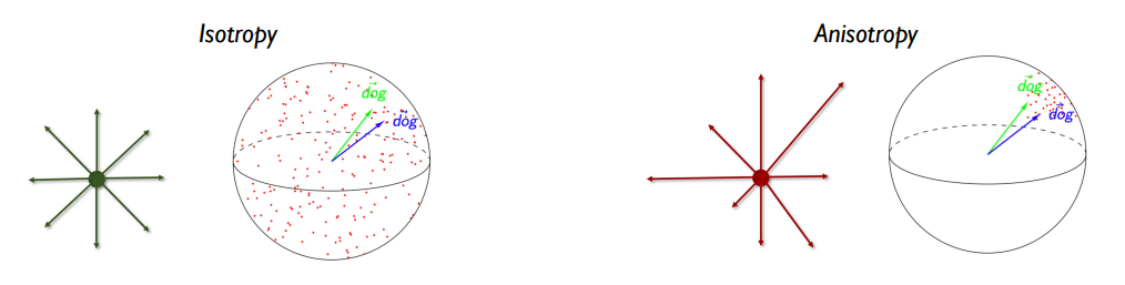 - Uniformity (균일성) : 핵심적인 문제로는 인코더에 태워 생성되는 임베딩 벡터들이 전체적인 임베딩 공간에 고르게 분포하지 못한다는 점이다. 모든 문장 임베딩이 특정 방향으로 치우쳐진 좁은 원뿔(Cone) 형태의 영역 안에 밀집하는 경향을 보인다고 "How Contextual are Contextualized Word Representations? 논문에서 지적하였다. 따라서, 논문에서는 이를 Anistropic 문제라고 명명하며, 임베딩 공간의 대부분을 낭비하고 표현력을 심각하게 저해하는 구체적인 원인이라고 언급하였다.