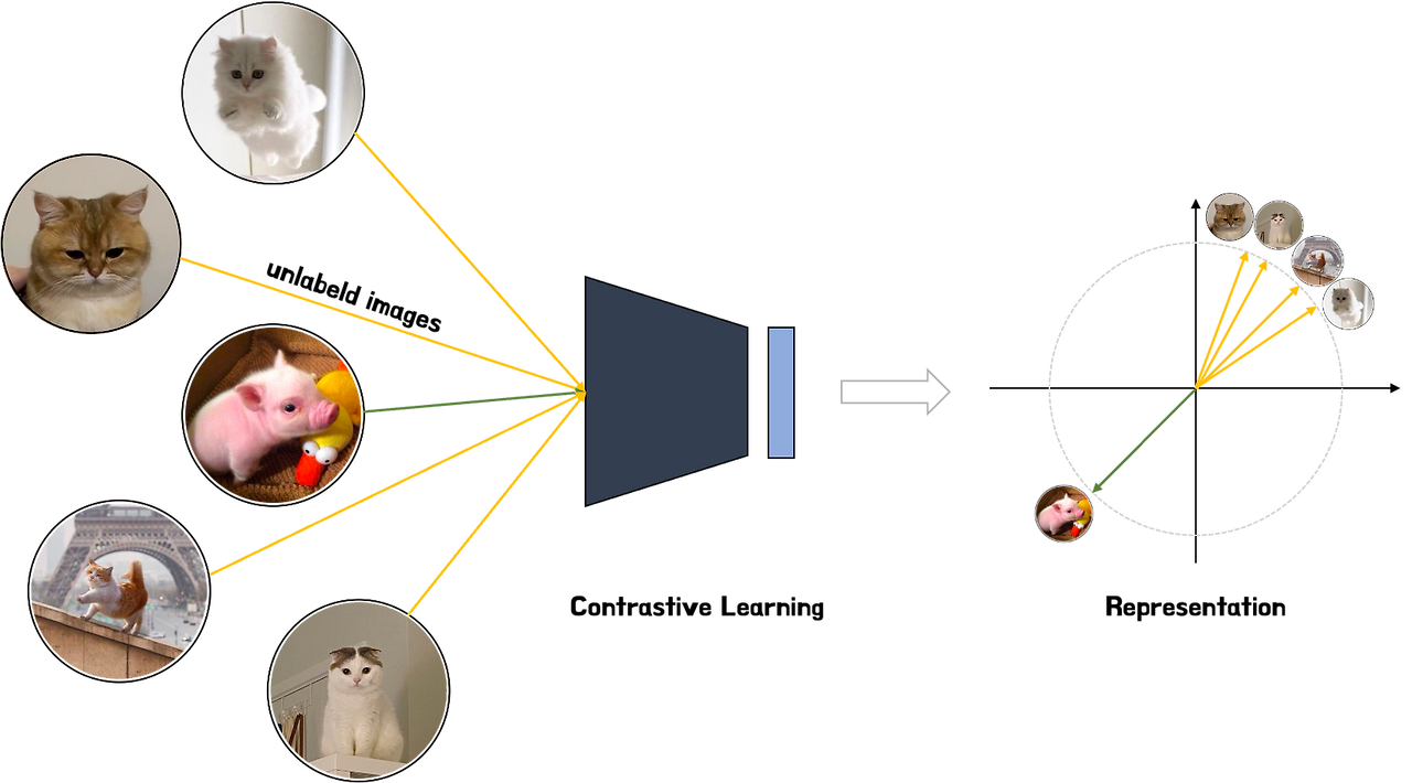 Contrastive Learning은 Self-Supervised Learning으로, 데이터의 고유한 특징을 효과적으로 학습하는 것을 목표로 한다. 핵심 아이디어는 생각보다 간단하다. 서로 유사한 데이터의 임베딩은 가깝게 만들고, 서로 유사하지 않은 임베딩은 멀게 만들도록 모델을 학습 시키는 것이다. 그렇다면, Contrastive Learning이 어떠한 이유로 인해 필요해졌는지 알아볼 필요가 있다. 기존의 지도 학습 같은 경우, 대량의 레이블 데이터가 필요한데, 이를 수집하는 과정에 많은 비용 혹은 시간이 소요가 된다. 반면에 비지도 학습은 레이블이 없이 모델을 학습할 수 있지만, 학습된 데이터의 표현이 굉장히 제한적이다. 이러한 문제점을 개선하기 위해 고안된 방법이 바로 Contrastive Learning이다.