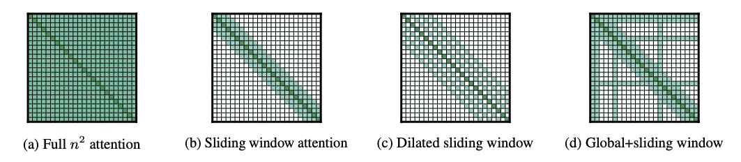 기존 트랜스포머의 어텐션 메커니즘은 모든 토큰이 시퀸스 내 다른 모든 토큰을 참조하기 때문에, 시퀸스 길이가 길어질수록 계산량이 기하급수적으로 증가하는 근본적인 한계점을 지닌다. 이러한 문제를 해결하고자 Allen Institute 연구진들은 "Longformer: The Long-Document Transformer" 논문을 발간하였다. 이는 Sliding Window Attention (SWA) 방법을 통해 각 토큰이 전체 시퀸스 대신 자신의 주변, 즉 고정된 크기의 윈도우 내에 있는 이전 토큰들에만 어텐션를 부여하는 방식을 제안하였다. 이러한 접근법은 연관성이 높은 문맥은 대부분 지역적으로 분포한다는 가정을 기반하여 계산량을 제곱 (O(N^2))에서 선형 (O(N x W))으로 줄이게 된다.