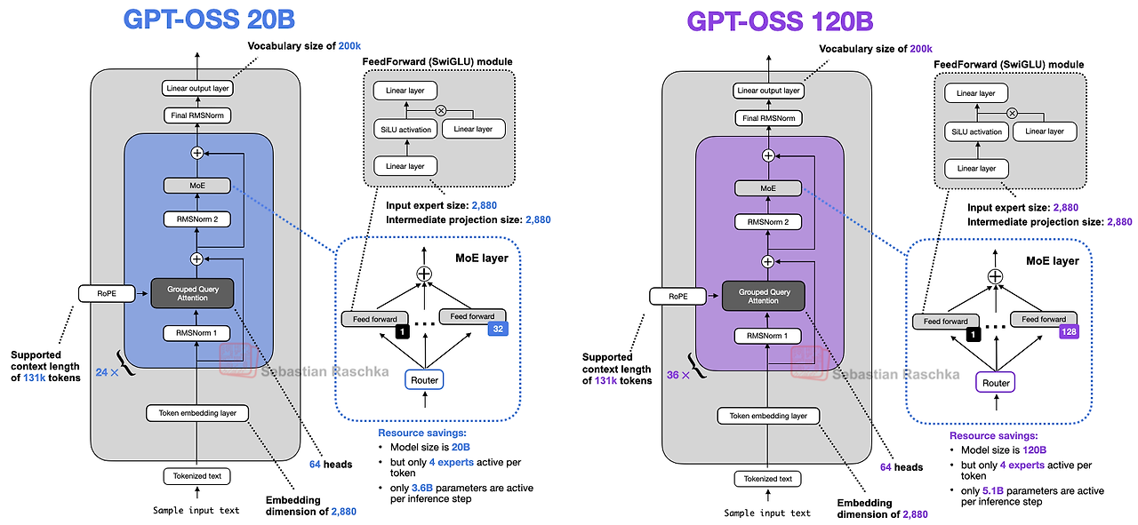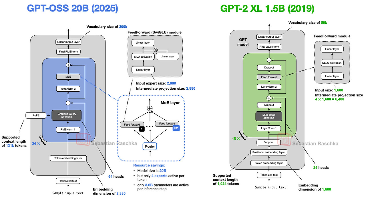2025년 8월 7일 기준으로 OpenAI의 open-weight 모델인 gpt-oss가 공개되었다. 이는 2019년도에 출시되었던 OpenAI의 초창기 모델인 GPT-2 이후로 공개된 모델이다. 이에 따라 본 게시물에서는 GPT-2 모델과 GPT-oss 모델 간의 차이를 깊숙하게 알아보고자 하며, 현재 출시되고 있는 대부분의 모델들의 공통점에 대해 다뤄보고자 한다. 본 게시물은 Sebastian Raschka 님의 게시물을 참고하여 작성하였음을 알립니다. 굉장히 좋은 내용이 많기 때문에 한번 방문해보시는 것을 권장 드립니다.