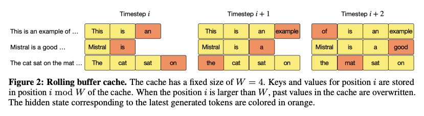 SWA를 효율적으로 구현하기 위해서는 Rolling Buffer Cache라는 핵심적인 기술이 사용된다. 이는 윈도우 크기 만큼의 이전 토큰들에 대한 Key와 Value 값을 저장하는 캐시로, 새로운 토큰이 처리될때마다 가장 오래된 Key-Value 쌍을 버리고 새로운 쌍을 추가하는 슬라이딩 방식을 기반으로 작동된다. 이를 통해 윈도우가 한 칸씩 이동할 때 겹치는 부분을 중복적으로 계산할 필요 없이 재활용하여 연산 효율성을 극대화 할 수 있게 되는 것이다.