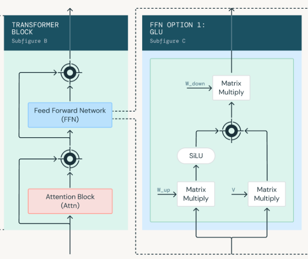 또한, 2020년도 구글 딥마인드의 Shazeer는 "GLU Variants Improve Transformer" 제목의 논문을 게재하였다. 이는 트랜스포머의 FFN을 Gated Linear Unit (GLU) 계열의 아키텍처로 교체하는 것을 통해 월등히 높은 성능과 안정성을 제고할 수 있다고 주장하였다. 여기에서 GLU는 서로 다른 선형 계층을 통과한 두 출력을 곱하는 방식으로 구현된다. 조금 더 구체적으로, 입력된 문맥을 보고 A라는 정보는 중요하니 100% 통과시키고, B라는 정보는 덜 중요하니 20%만 고려하겠다와 같이 정보의 흐름을 동적으로 제어할 수 있는 게이트 매커니즘이라고 생각하면 될거 같다.