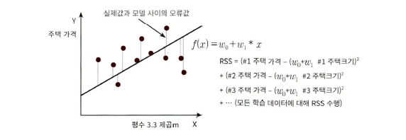 - 일반 선형 회귀: 예측값과 실제값의 RSS를 최소화할 수 있도록 회귀 계수 최적화